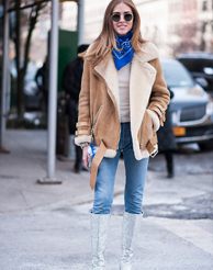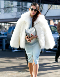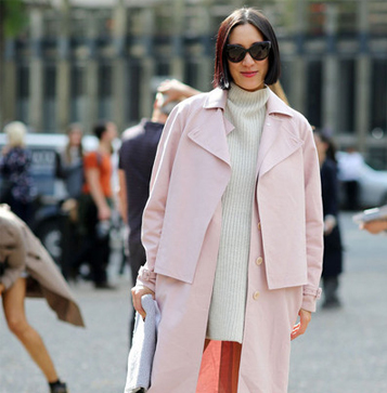 Instagram時(shí)尚伙伴關(guān)系負(fù)責(zé)人Eva Chen用簡(jiǎn)約的粉色大衣搭配白色長(zhǎng)款高領(lǐng)針織裙,輕松制造出層次感,絨毛裝飾的尖頭高跟鞋更具玩味。